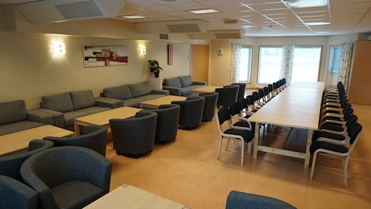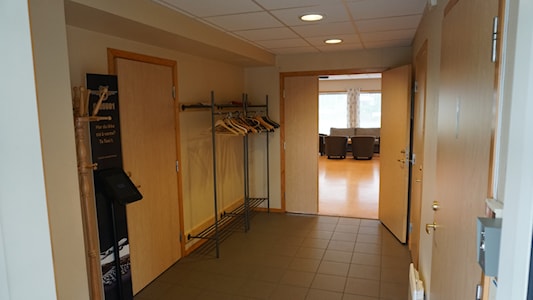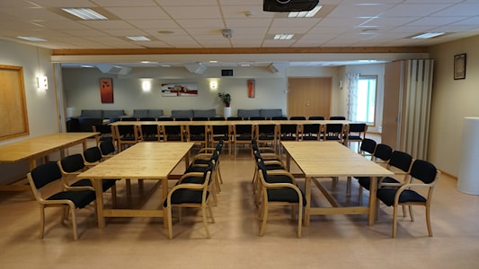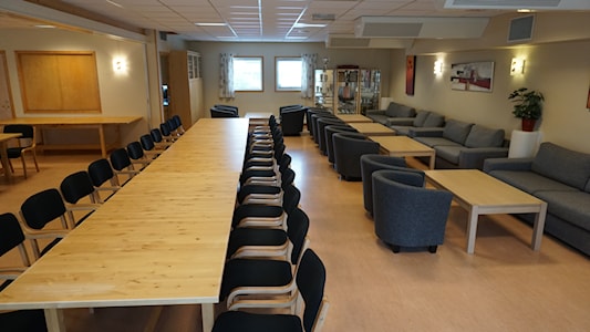 Møte-/selskapslokalet er utstyret for å kunne dekke til 60-65 personer. Vi har lydanlegg med mikrofon og AV-anlegg.